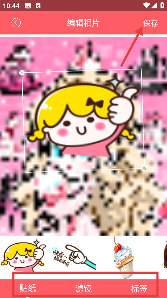 2、用戶完成貼紙等編輯后,此時可借助底部貼紙、濾鏡、標簽功能,繼續豐富照片效果讓作品更獨特,接著用戶點擊界面右上角保存按鈕確認保存操作。