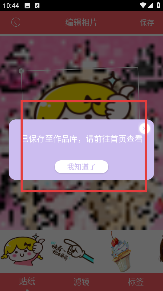 3、點擊保存后會彈出已保存至作品庫請前往首頁查看提示,點擊我知道了即可完成保存操作,后續可在首頁作品庫中,找到并查看、管理已保存的作品。