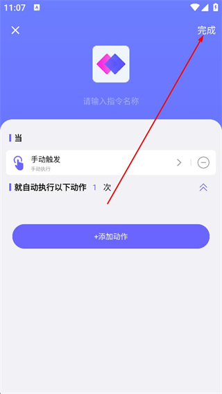4、完成指令名稱觸發方式、執行動作等各項內容的設置后,點擊界面右上角的完成按鈕,即可保存這條自定義指令。