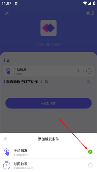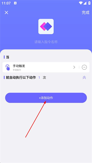 2、在編輯界面中先輸入指令名稱,接著選擇觸發方式,再點擊添加動作按鈕,就能為指令配置需要自動執行的操作。