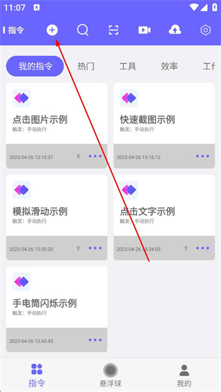2、指令頁面有我的指令等分類,展示示例指令,可搜索內容,部分需開啟權限運行。