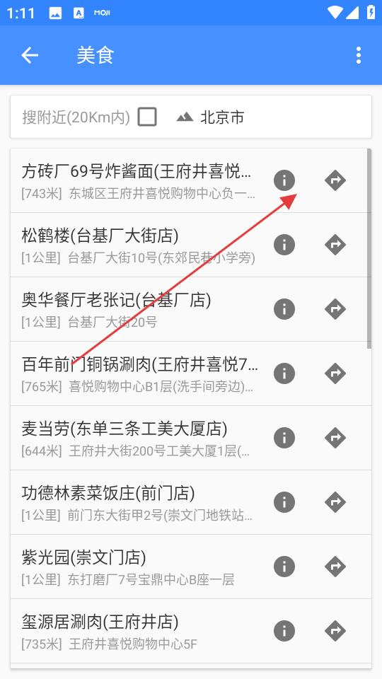 2、在美食列表,找到心儀店鋪比方磚廠69號炸醬面,點擊店鋪旁信息按鈕,進入路線規劃頁。