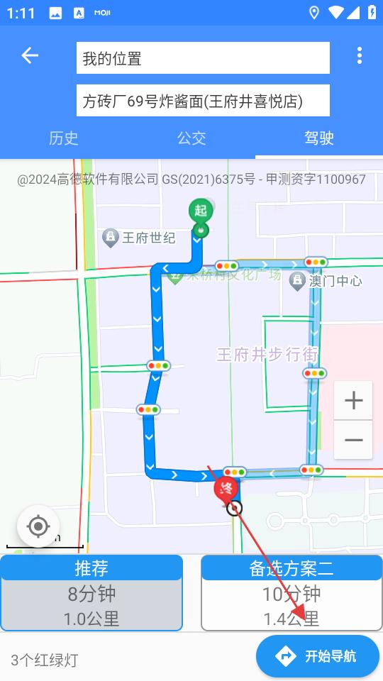 3、在路線規劃頁,查看推薦與備選方案,選擇合適路線,點擊開始導航,按導航前往美食店鋪。
