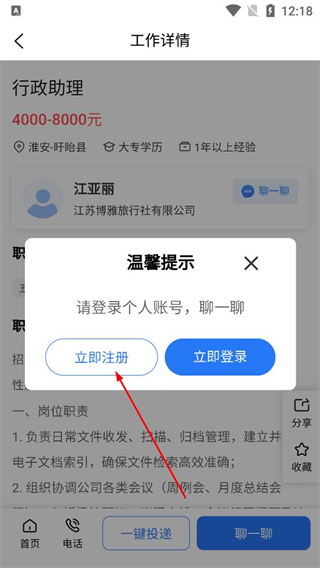 2、在工作詳情頁查看職位薪資福利及職責描述,點擊聊一聊按鈕,觸發需要登錄賬號的溫馨提示彈窗。