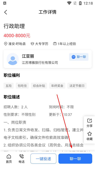 1、打開軟件進入找工作頁面,瀏覽推薦的職位列表,選擇行政助理相關點擊進入該職位的工作詳情頁面。