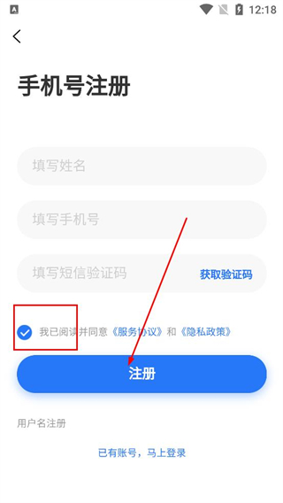 4、在注冊頁面填寫姓名手機號,獲取并填寫短信驗證碼,勾選相關協議后點擊注冊按鈕完成賬號注冊。