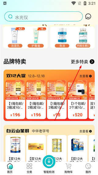 2、登錄后進入首頁瀏覽潔面乳護臀膏等商品分類,查看品牌特賣板塊的商品,點擊更多特賣按鈕,進入完整的品牌特賣商品列表頁面。
