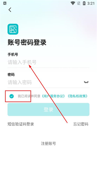 1、進入賬號密碼登錄頁面,在手機號碼框填寫對應號碼,輸入登錄密碼,勾選已閱讀相關協議的選項,點擊登錄按鈕完成賬號登錄。