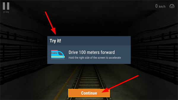 2、根據提示,長按屏幕右側加速,完成向前行駛100米的任務,熟悉地鐵的前進操控方式,推進駕駛訓練。