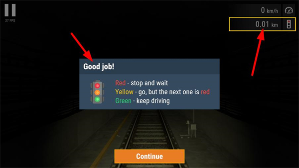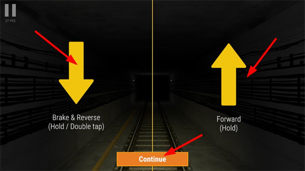 1、了解操作規則,左側按鈕控制剎車和倒車,右側按鈕控制前進,點擊Continue進入駕駛環節,開啟地鐵操控流程。