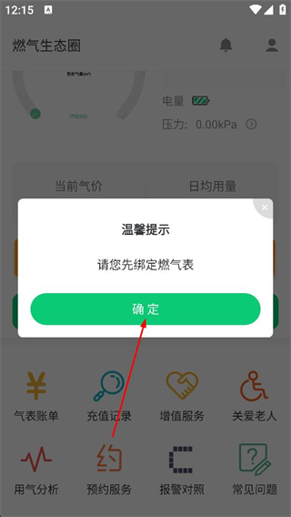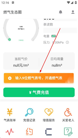 1、打開燃氣生態圈軟件,進入主界面后找到輸入9位燃氣表號開通燃氣表的按鈕,點擊該按鈕,觸發綁定燃氣表的溫馨提示彈窗。