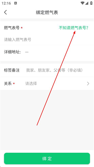 2、在溫馨提示彈窗中點擊確定按鈕,進入綁定燃氣表頁面,查看頁面中的燃氣表號輸入框等信息,找到不知道燃氣表號的選項。