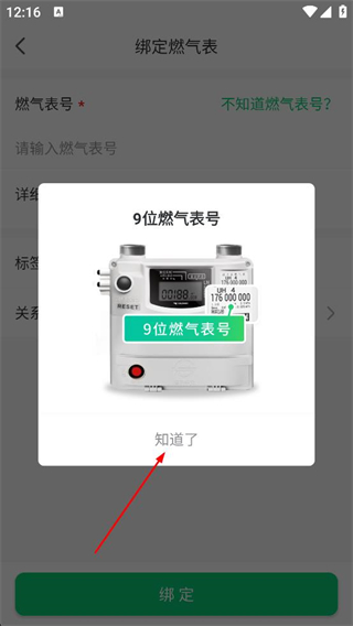 4、在提示框中點擊知道了按鈕關閉彈窗,回到綁定燃氣表頁面,準備輸入獲取到的燃氣表號,填寫其他相關信息完成燃氣表綁定。