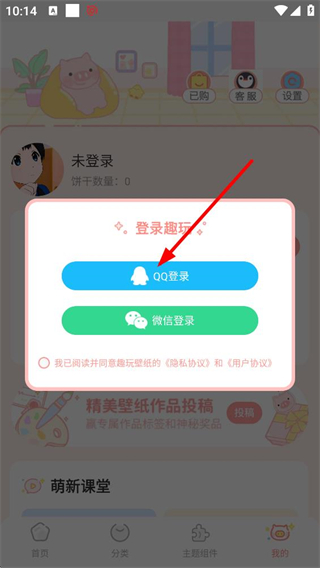3、我的頁面觸發登錄后,彈出登錄趣玩窗口,提供QQ登錄微信登錄兩種方式,需先勾選同意相關協議,才能進行登錄操作。