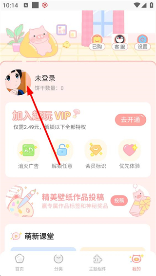 2、進入我的頁面,呈現未登錄狀態與餅干數量,設有加入趣玩VIP的開通入口,還包含精美壁紙作品投稿板塊及萌新課堂等內容區域。