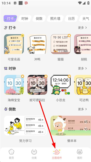 4、進入主題組件頁面,包含打卡時鐘倒數等分類板塊,每個分類下有不同樣式的組件,可根據需求選擇對應的組件來使用。