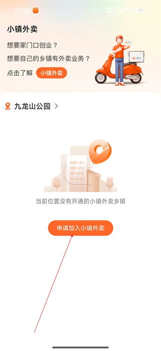 1、打開軟件進入小鎮外賣頁面,當前位置無開通業務,點擊申請加入小鎮外賣按鈕,進入加盟選項頁面。