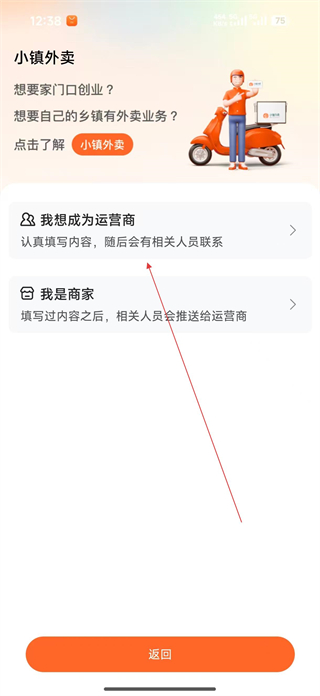 2、在加盟選項頁面選擇我想成為運營商,點擊進入小鎮加盟頁面,查看小鎮外賣的介紹信息。