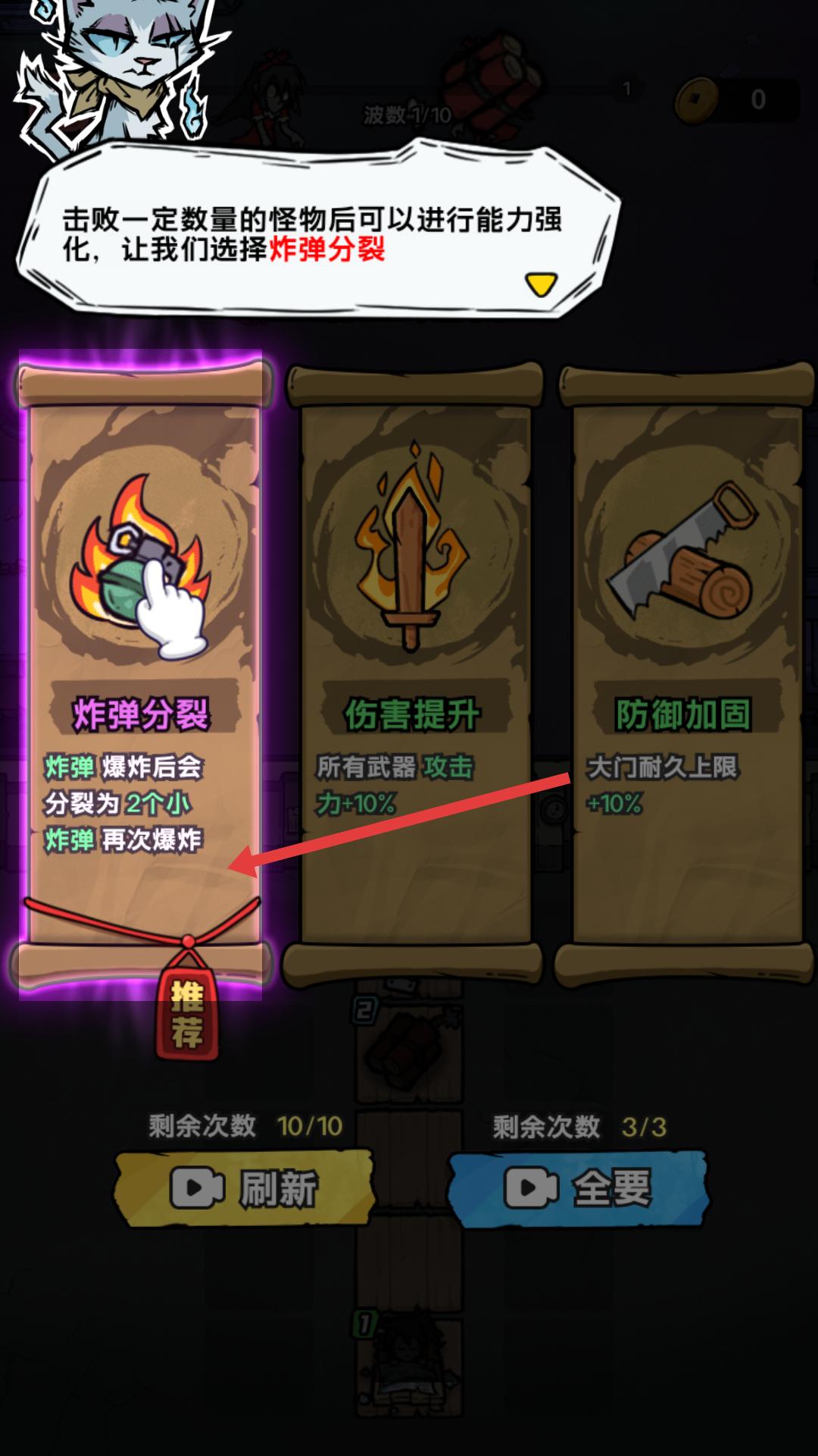 3、擊敗一定數量怪物后,會出現能力強化選項,推薦選擇【炸彈分裂】,炸彈爆炸后會分裂為2個小炸彈再次爆炸,能增強輸出。