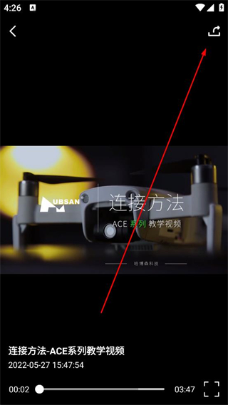 3、在教學視頻播放界面點擊右上角分享圖標,可將連接方法ACE系列教學視頻分享給他人,方便一起學習無人機連接操作。