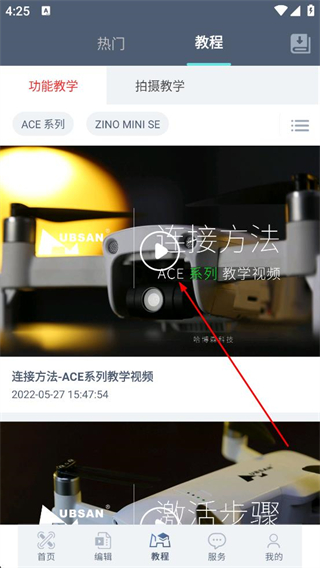 2、點擊底部教程選項進入教程頁面后選擇功能教學,找到連接方法ACE系列教學視頻,點擊播放按鈕,即可觀看無人機連接方法的詳細教學內容。