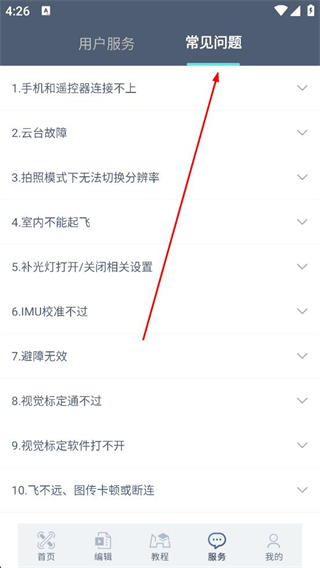 4、點擊底部服務選項選擇常見問題標簽,可查看手機和遙控器連接不上、云臺故障等多種無人機使用問題的解答,解決操作疑惑。
