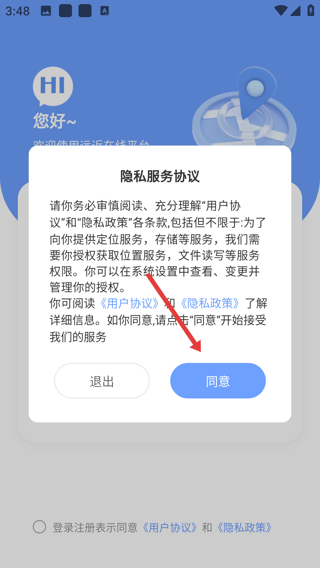 1、使用遠近在線平臺時,需先在隱私服務協議彈窗點擊同意,以授權相關權限并接受服務。