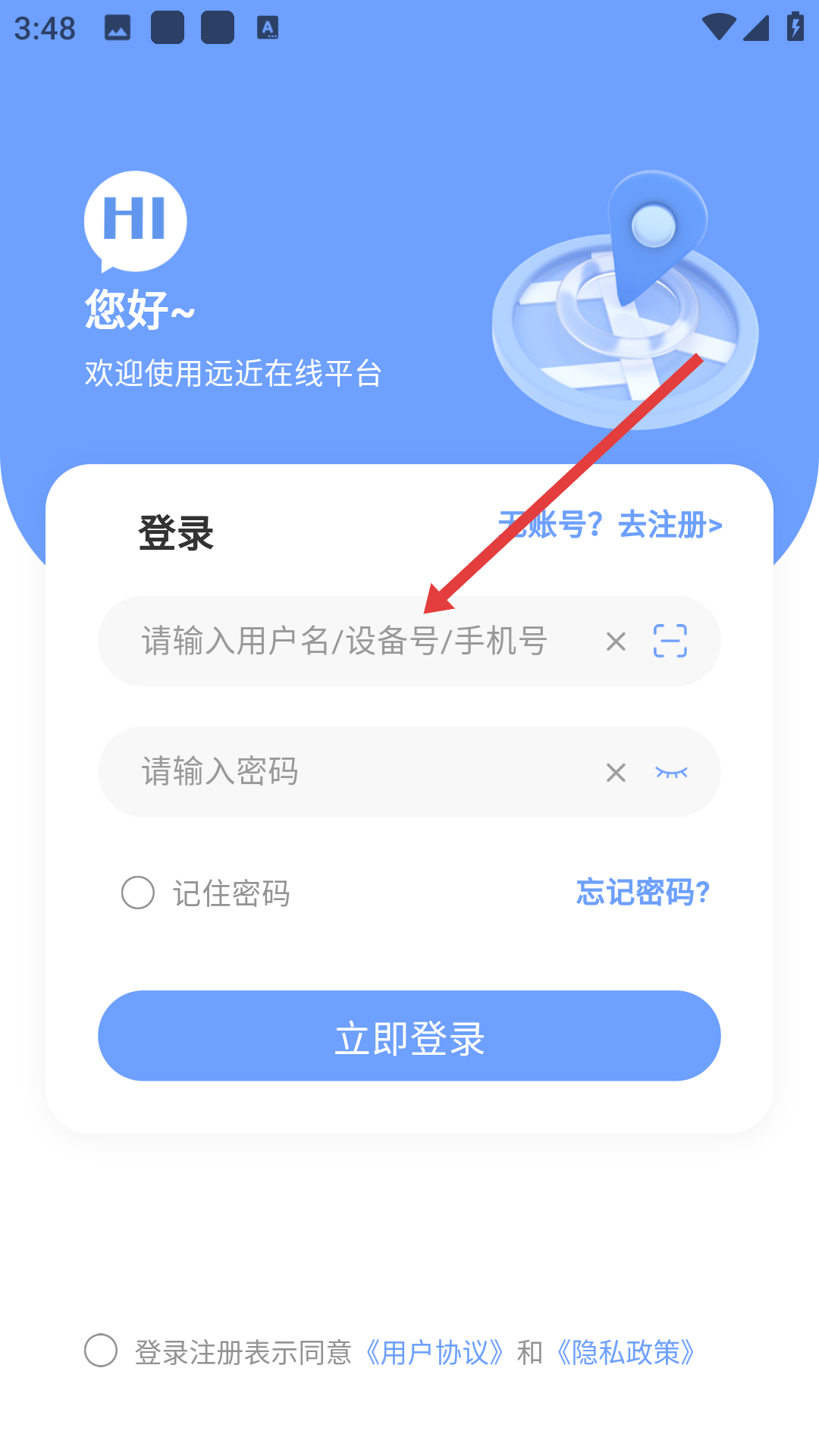 2、登錄遠近在線平臺,可在對應輸入框輸入用戶名、設備號或手機號,搭配密碼,點擊立即登錄完成操作。