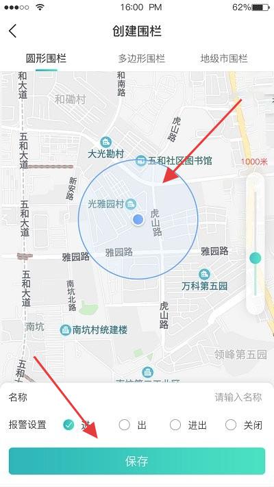 3、在遠近在線平臺的創建圍欄功能中可設置圓形圍欄,輸入圍欄名稱、選擇報警設置后,點擊保存即可完成創建。