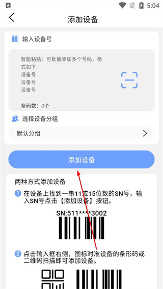 4、進入添加設備頁面在輸入設備號欄填寫對應SN號,選擇設備分組,確認信息后點擊添加設備按鈕,也可通過掃描條碼添加設備。