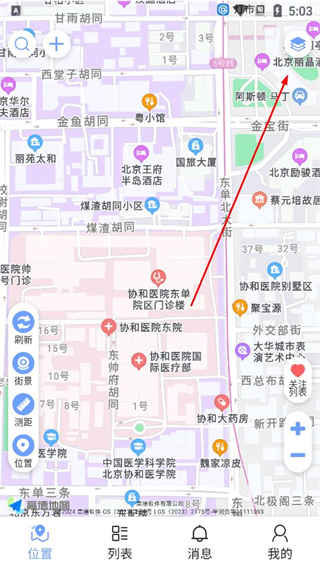 1、進入位置頁面,查看當前地圖展示的區域信息,點擊對應按鈕打開地圖選擇界面,可看到多種地圖類型及地圖平臺選項供選擇。