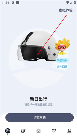 2、進入對應頁面選擇虛擬體驗,查看功能助手獲取用車回答,點擊綁定車輛按鈕,選擇設備完成綁定操作,以便后續使用軟件關聯的出行功能。
