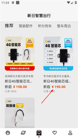 4、進入新日智慧出行頁面,切換智能配件積分購車等,瀏覽4G智能芯轉接線等商品,查看商品價格及銷量信息,按需選擇對應產品了解詳情。