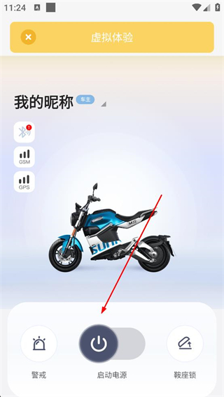 3、在虛擬體驗頁面設置我的昵稱,查看展示的車輛信息,點擊啟動電源按鈕操作車輛,也能選擇警戒鞍座鎖等功能,體驗車輛相關的控制選項。