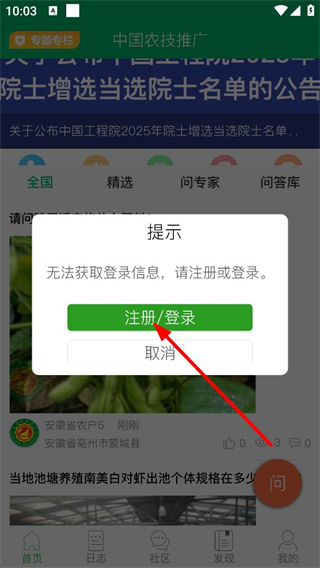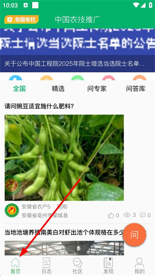 1、進入應用首頁,可通過全國、精選等頻道瀏覽農技相關資訊與問題,點擊底部對應功能按鈕,可切換至不同功能頁面。