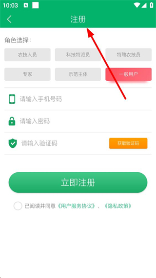 4、進入注冊界面,需先選擇對應角色,再填寫手機號碼、密碼、驗證碼等信息,勾選協議后點擊立即注冊完成賬號注冊。