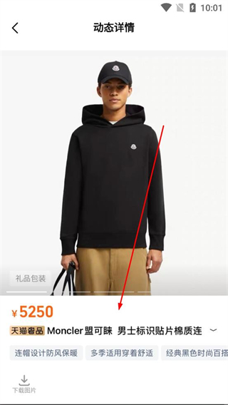 3、進入商家主頁后找到商品動態板塊點擊其中的徽章連帽毛圈衛衣商品,進入該商品動態詳情頁。