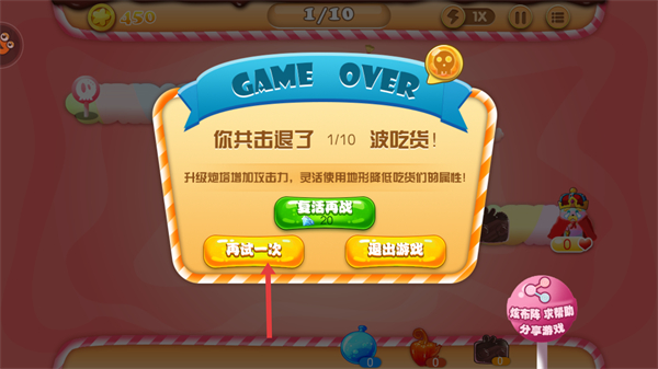 4、若防御失敗,會出現游戲結束界面,顯示擊退吃貨的波數,可選擇再戰一次重新挑戰或退出游戲。