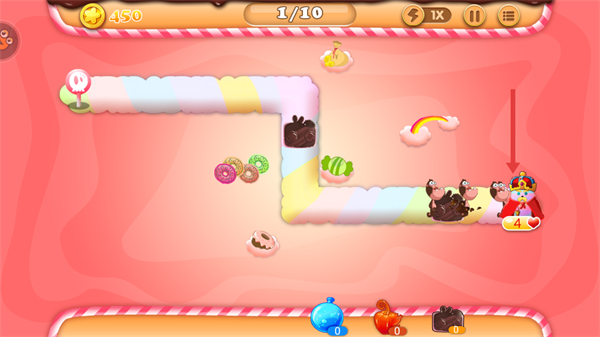 2、有猴子模樣的角色沿著糖果路徑移動,要利用巧克力等元素,阻止它們靠近戴皇冠的角色,守護目標。