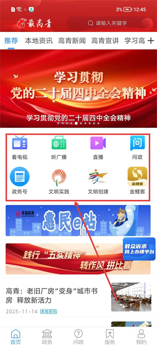 1、打開最高青APP,進入首頁瀏覽推薦板塊的各類資訊,如學習貫徹黨的二十屆四中全會精神、了解本地和時政動態。