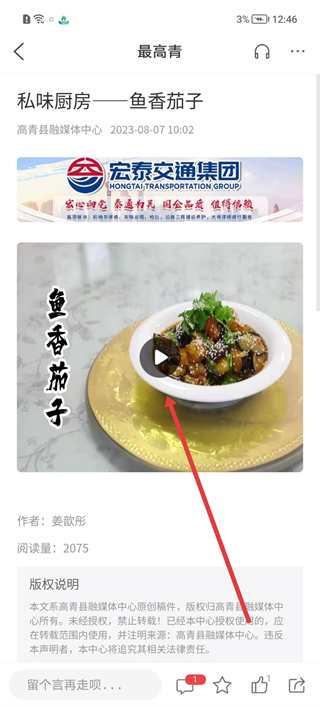 4、選擇感興趣的新聞,如私味廚房——魚香茄子的資訊,進入新聞詳情頁面,瀏覽文章內容和相關資訊。