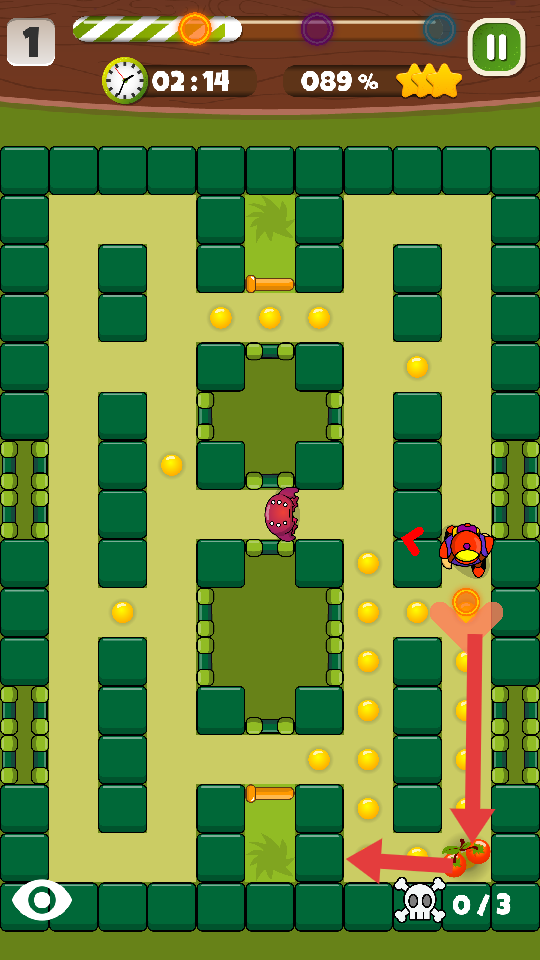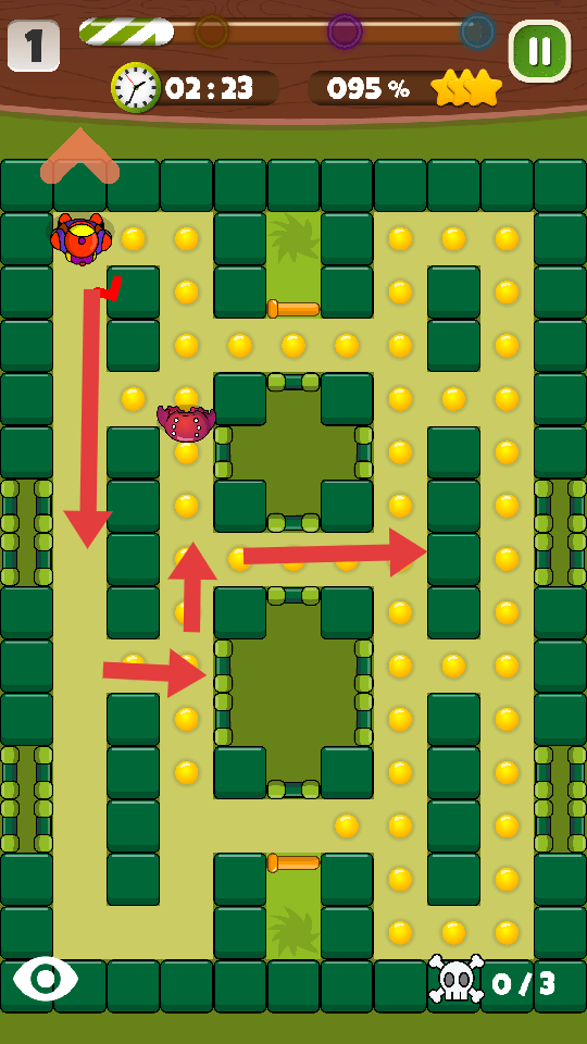 2、在迷宮里,跟隨箭頭指示移動,收集金幣,同時留意紅色怪物位置,避免被其捕捉,爭取高完成度。