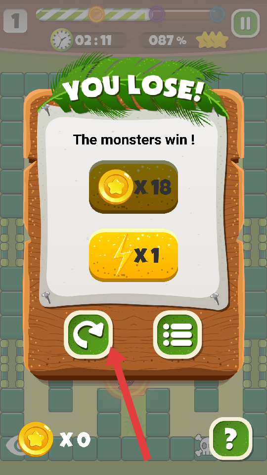 4、若游戲失敗,界面顯示你輸了,點擊左側重玩按鈕,重新開始游戲,再次挑戰迷宮冒險。