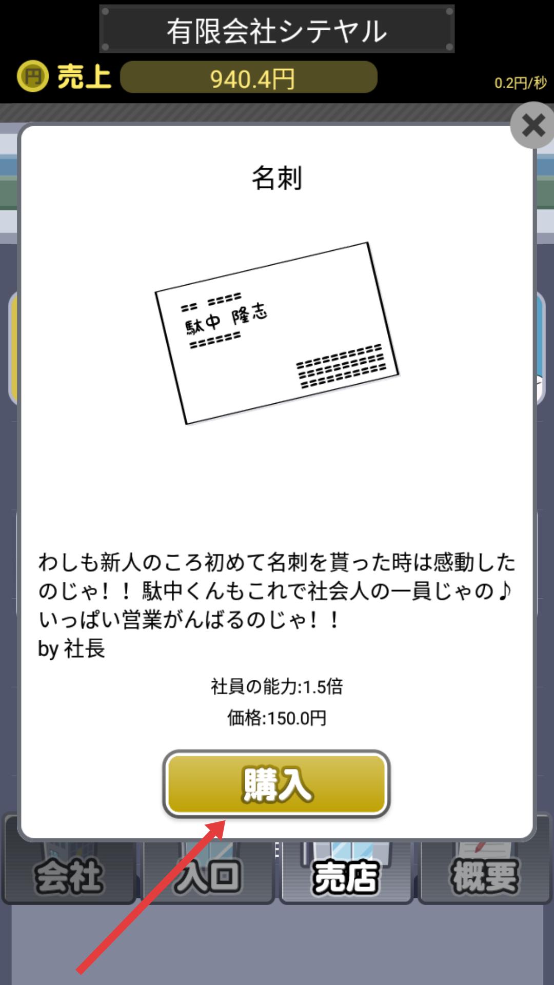 3、遇到名片相關界面,若有購買選項,點擊購入,可獲得名片,能提升社員能力,對公司經營有積極作用。