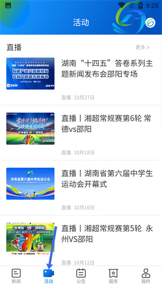 2、活動板塊,有湖南十四五發布會、湘超常規賽、中學生運動會開幕式等直播活動,聚焦政務和文體賽事。