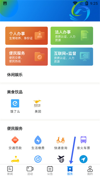 4、服務板塊,提供政務、美食、便民服務,政務含個人和法人辦事等,美食有餓了么美團,便民有交通罰款、生活繳費等。
