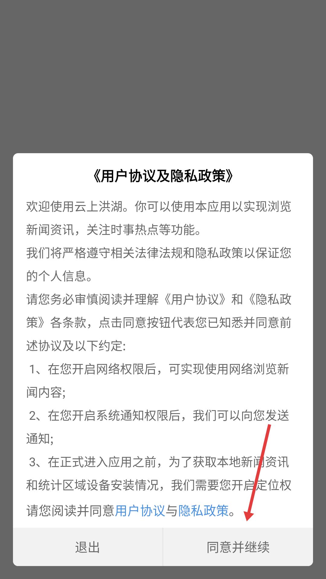 1、打開云上洪湖手機版,閱讀用戶協議及隱私政策后,點擊同意并繼續進入民聲板塊。