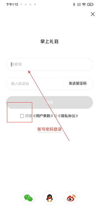 1、進入掌上禮縣登錄頁,輸入手機號,點擊發送驗證碼并填入,勾選同意用戶條款及隱私協議選項,完成賬號登錄。