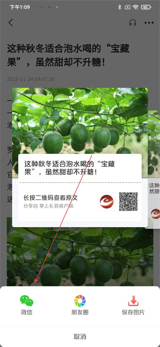 4、在詳情頁找到分享按鈕點擊彈出分享選項,選擇微信等渠道,完成該資訊內容的分享。