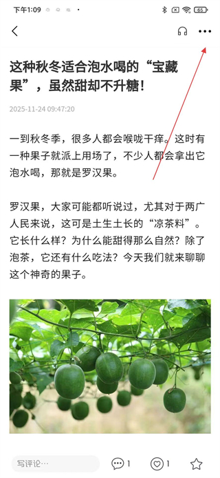 3、在資訊詳情頁中閱讀羅漢果的相關介紹,了解其特點、食用方法等內容,同時可點擊右上角的三個點按鈕。